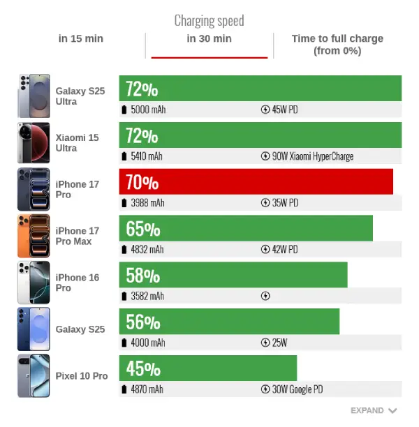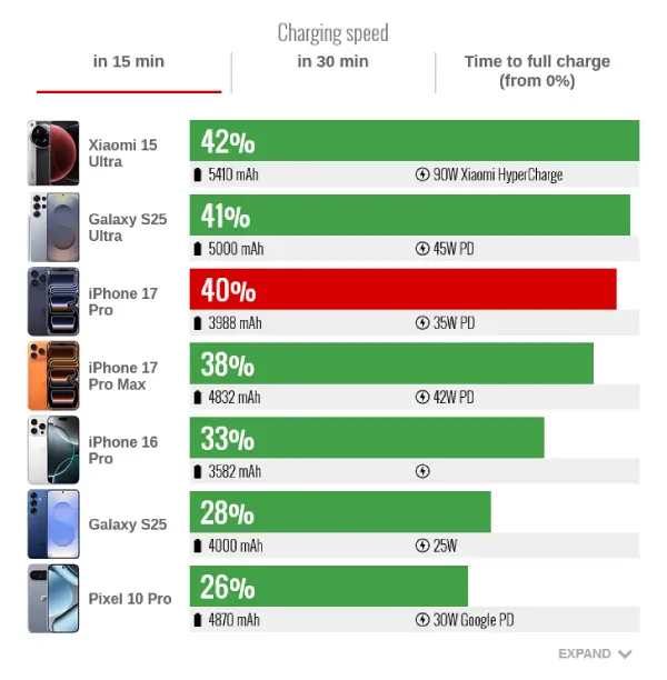 سلفیهای آن مشابه سایر مدلهاست، دوربینی در پشت دارد، صفحهنمایشی در واقع بزرگتر از آیفون ۱۷ پرو دارد و اگرچه عمر باتری آن به همان اندازه طولانی نیست، اما همچنان استقامت بهتری از آنچه انتظار داشتیم ارائه میدهد.